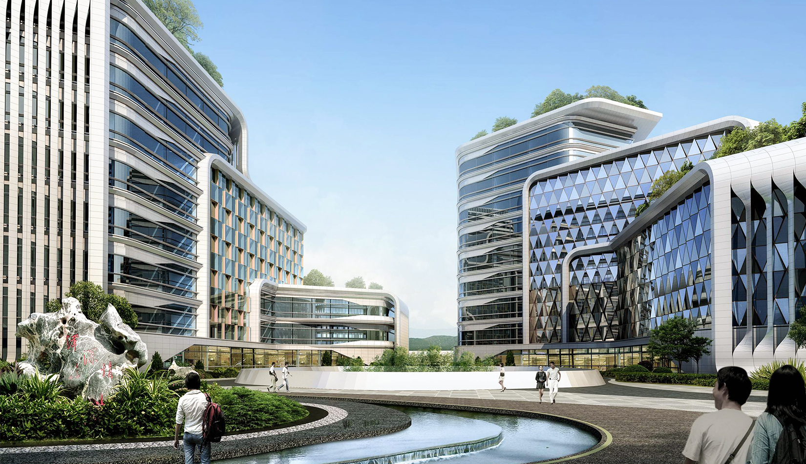 整個(gè)園區(qū)內(nèi),散落著五個(gè)獨(dú)特的建筑單體,分別以不同的顏色代表五大洲建筑形象,與五環(huán)顏色相匹配。象征著院士們來自于五湖四海,匯聚在院士港這個(gè)港灣。
