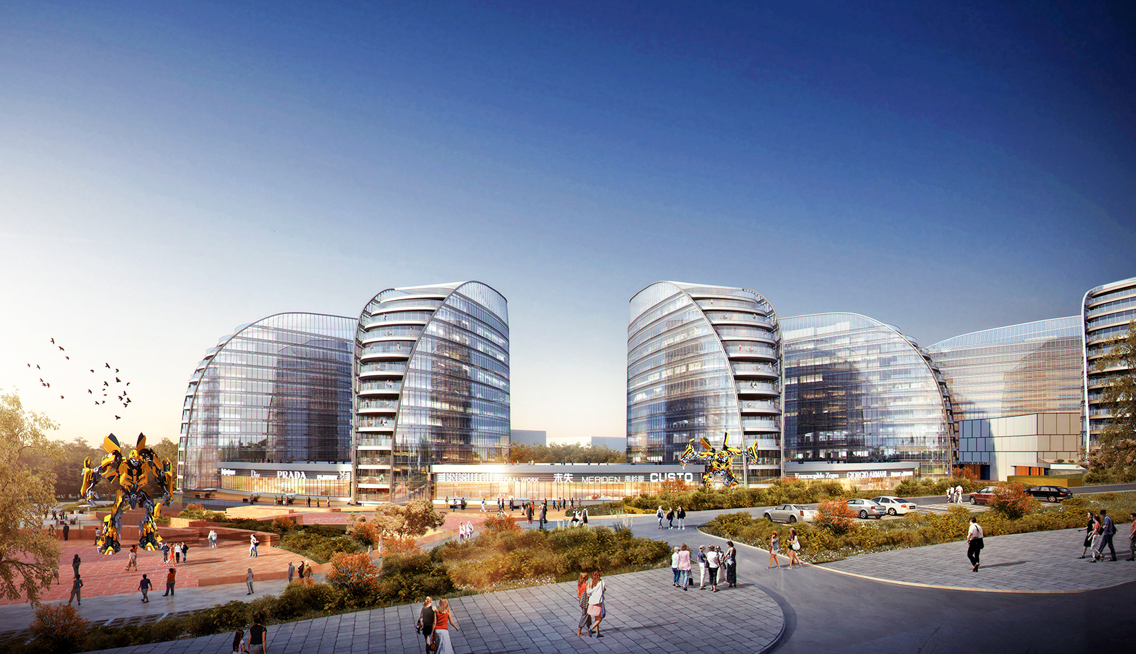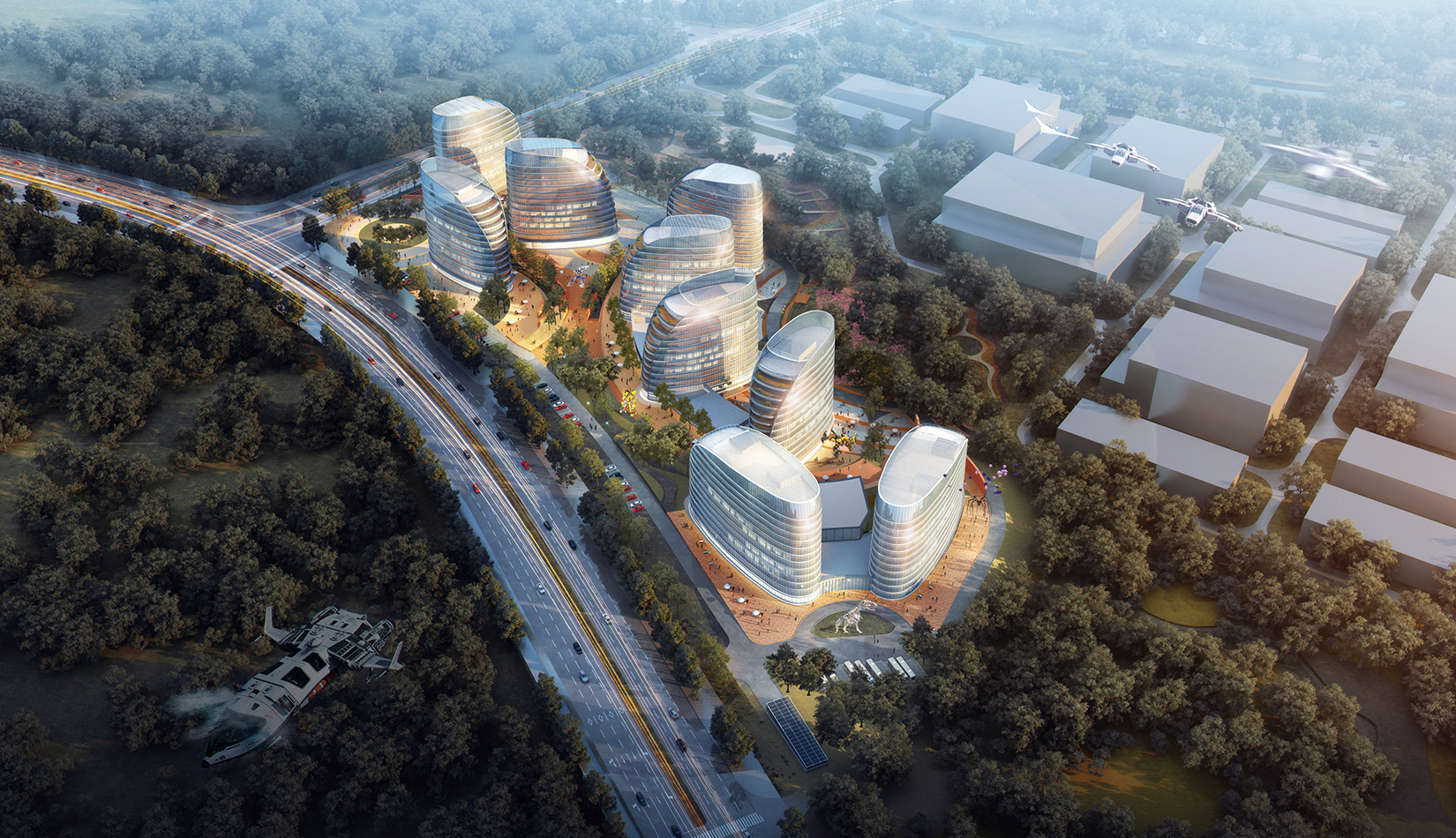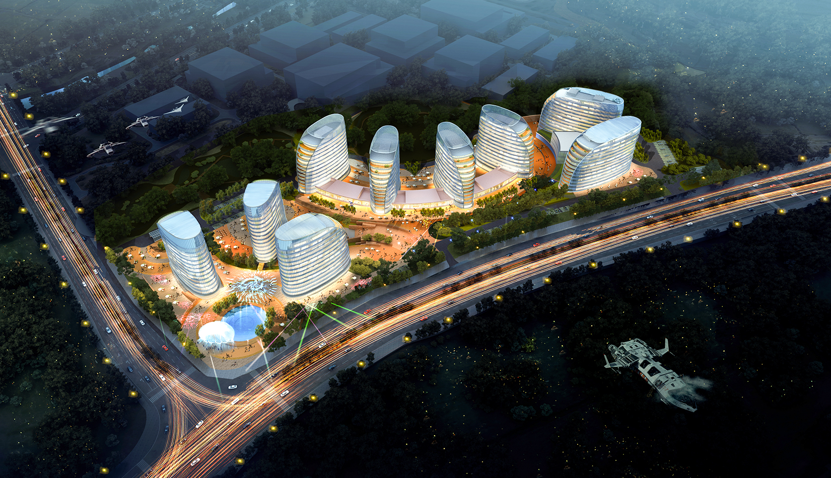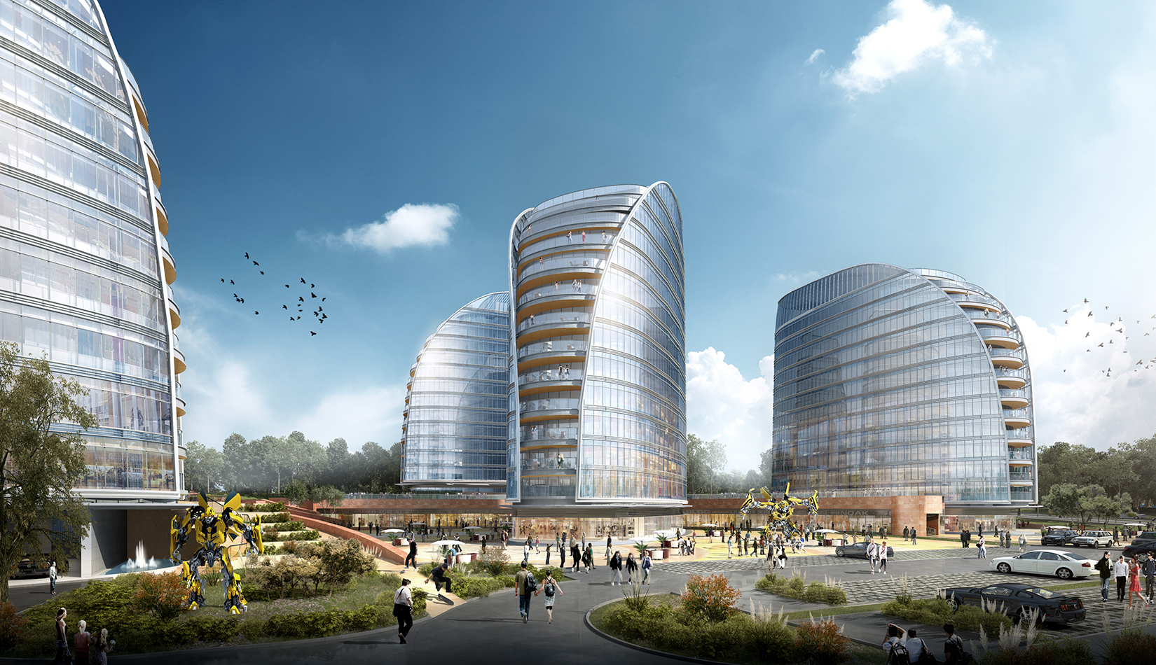 注重地塊內(nèi)空間環(huán)境的滲透和景觀視線效果,保持地塊環(huán)境與城市環(huán)境的共融性,提升城市空間價值。建筑外觀采用簡潔、現(xiàn)代的風格,立面形象富有視覺沖擊力,樹立企業(yè)品牌與形象。高層建筑層層平臺向景觀蔓延,為人們提供豐富多變的生活工作空間。底層平臺上的文化內(nèi)街,結(jié)合影視特色主題,聚集人氣,串聯(lián)互動。曲線連廊內(nèi)部空間流動,成為具有活力的公共交往場所。