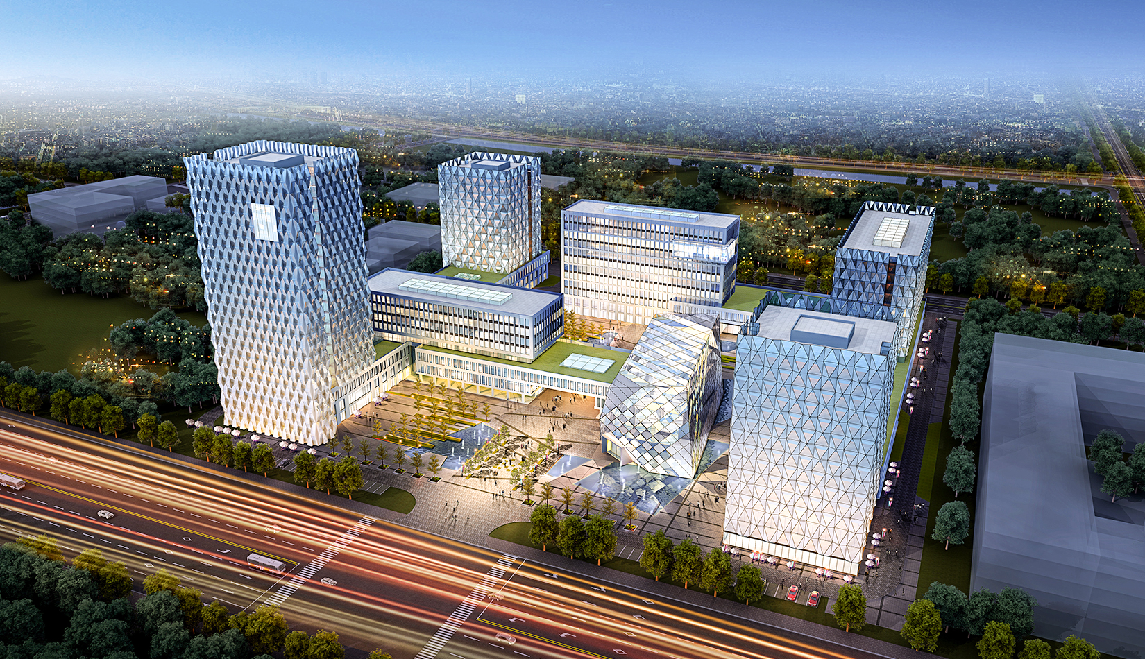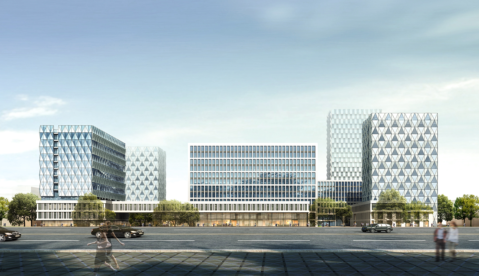 建筑立面風(fēng)格現(xiàn)代簡(jiǎn)潔,高層塔樓以玻璃與金屬幕墻為主,塑造其硬朗簡(jiǎn)潔的建筑性格,內(nèi)部?jī)蓷澖ㄖ捎酶駱?gòu)式立面風(fēng)格,同樣以簡(jiǎn)潔為設(shè)計(jì)原則,展現(xiàn)其富有理性秩序的立面形象。