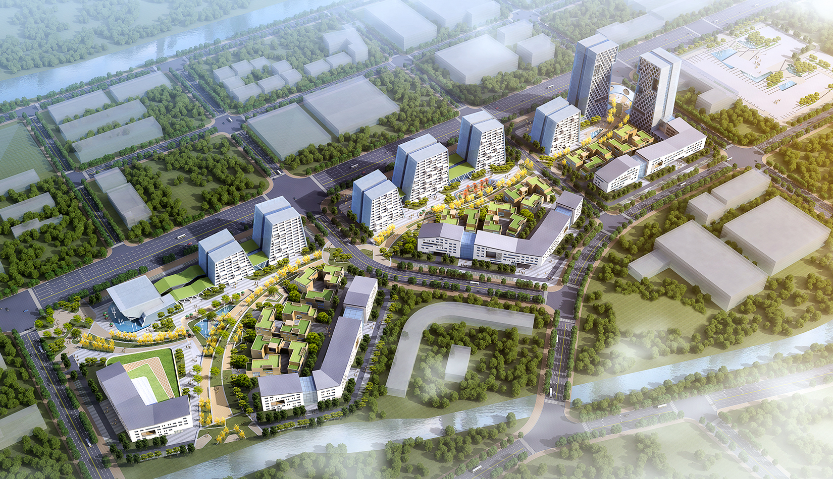 為了打造一個完美的城市沿街形象,以及營造一個安靜舒適的工作與休閑空間,我們采用了半圍合的規(guī)劃布局,北側(cè)高層建筑基本成“一”字布局,高低錯落,塑造完美的城市天際線,宛如一條盤旋上升的巨龍;在南側(cè)一個個長方形建筑成折線型連續(xù)排列,隔離周邊嘈雜的城市環(huán)境,猶如越出水面的“金鱗”,中央景觀帶東西側(cè)以友好的姿態(tài)向城市開放,美化城市形象。\