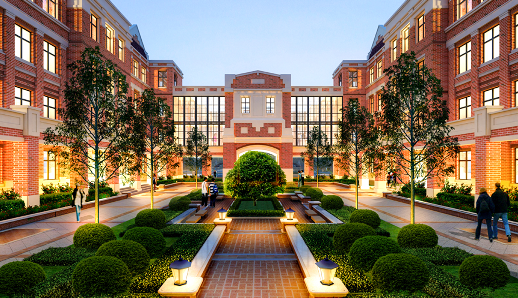 學(xué)院派的院落空間布局: 規(guī)整的建筑軸線布局,古典的建筑界面,方整的院落交流空間,結(jié)合廣場、綠地,營造百年學(xué)府的低調(diào)。