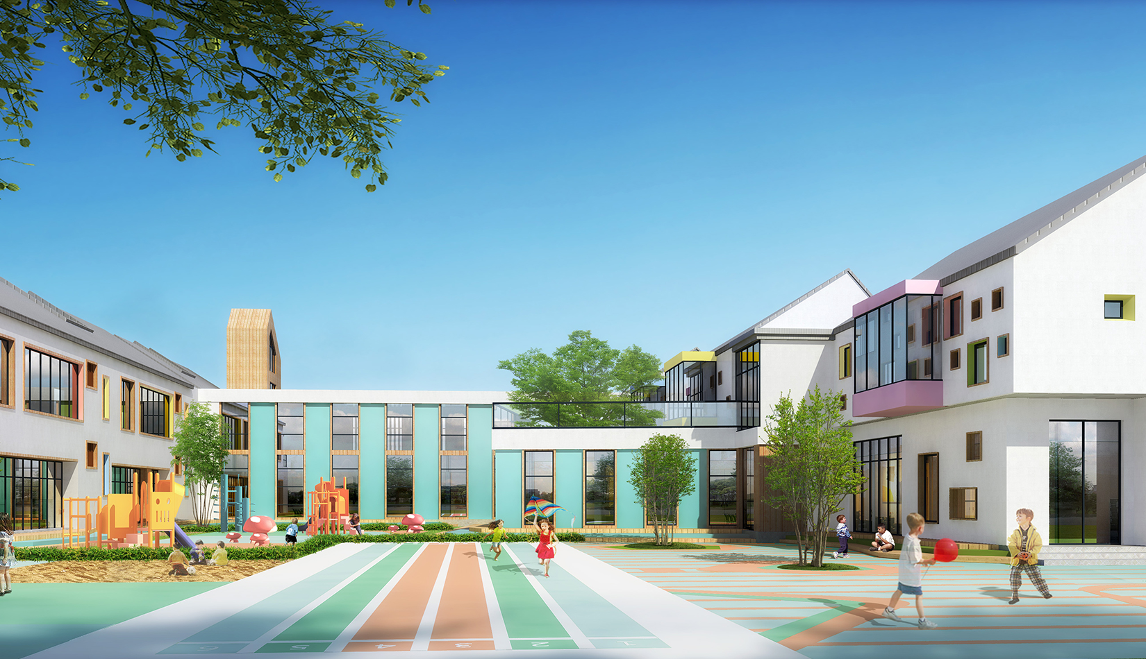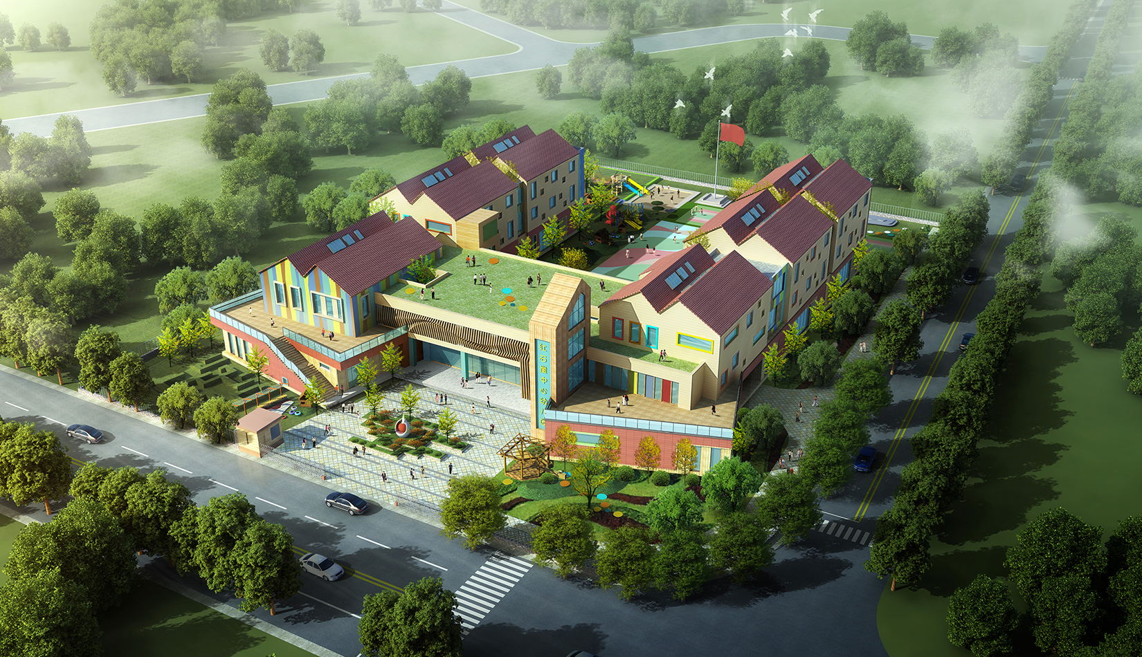 建筑造型來源于兒童最初對房子的印象并進(jìn)行延伸,加上積木搭接形態(tài),形成C字形圍合的主體建筑,就像父母溫暖的懷抱;建筑造型跟兒童產(chǎn)生很好的親切感,讓兒童將上幼兒園成為快樂的事情。同時(shí)形態(tài)結(jié)合地緣文化特色,采用雙折坡屋頂,寓意展翅翱翔的海鷗。