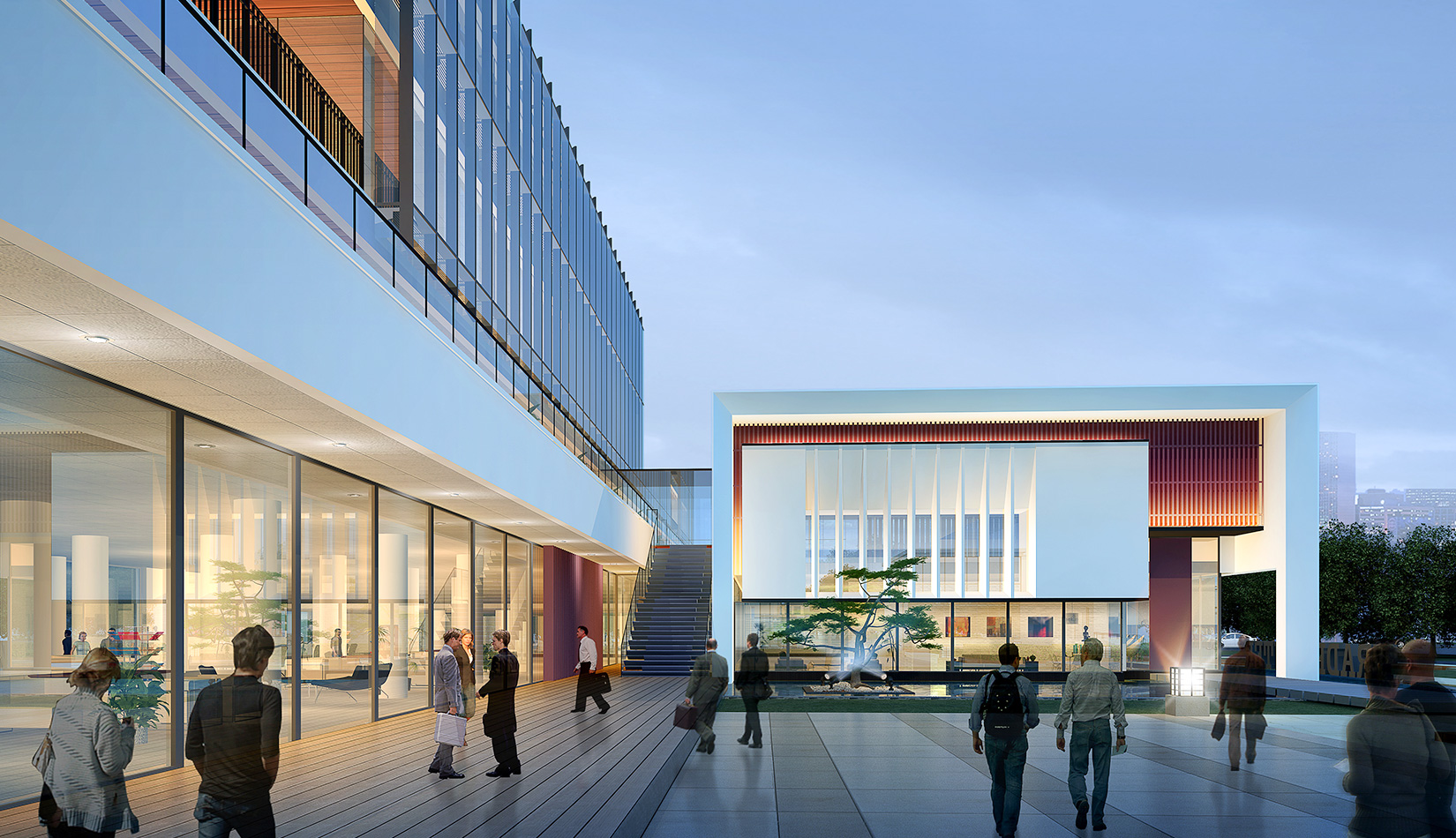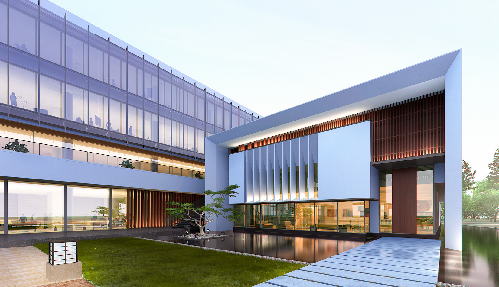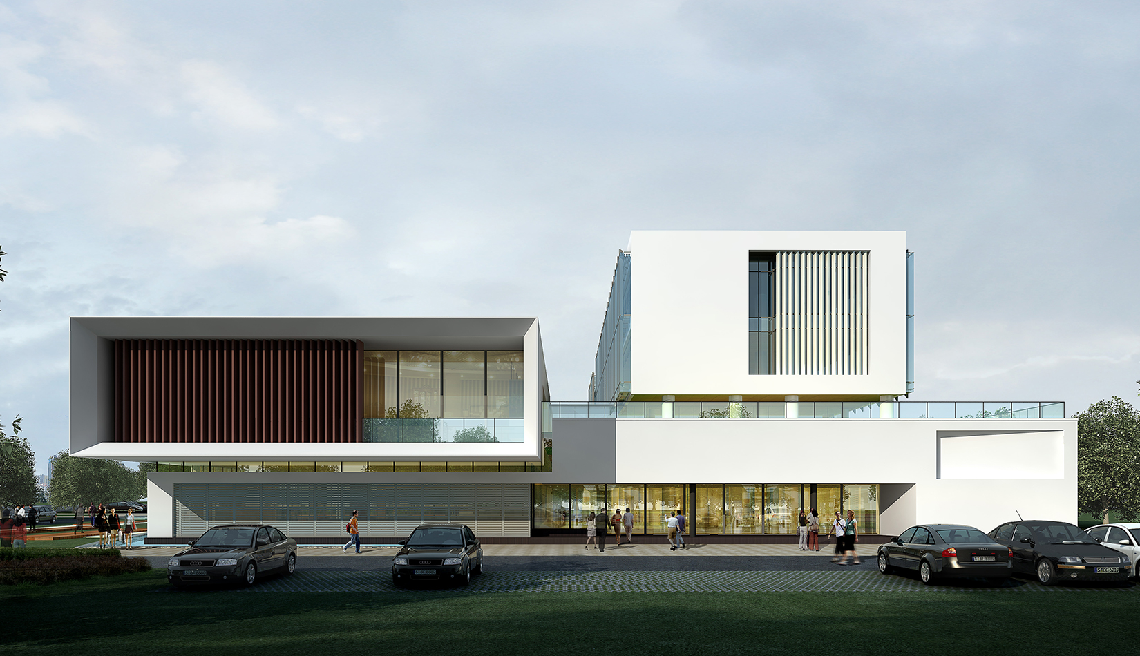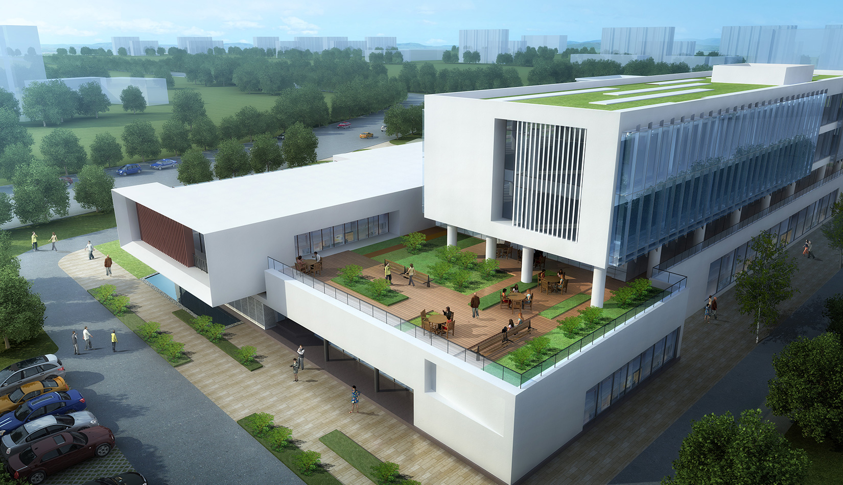 作為中韓貿(mào)易合作區(qū)一期啟動(dòng)區(qū)的重點(diǎn)項(xiàng)目,其承擔(dān)著對外展示以及為后續(xù)發(fā)展提供服務(wù)平臺的功能。因此設(shè)計(jì)力求穩(wěn)重大氣,以4 層的體量打造出地標(biāo)性的建筑。設(shè)計(jì)運(yùn)用簡潔的外形、寧靜的色彩,外立面以白色涂料和木格柵為主,尊重自然,打造一種平和寧靜的感覺。在空間設(shè)計(jì)上通過共享空間、上人露臺和一層大平臺,創(chuàng)造出舒適宜人的工作環(huán)境;在技術(shù)上通過地源熱泵、呼吸式幕墻、雨水收集等的應(yīng)用,實(shí)現(xiàn)建筑的綠色節(jié)能環(huán)保。