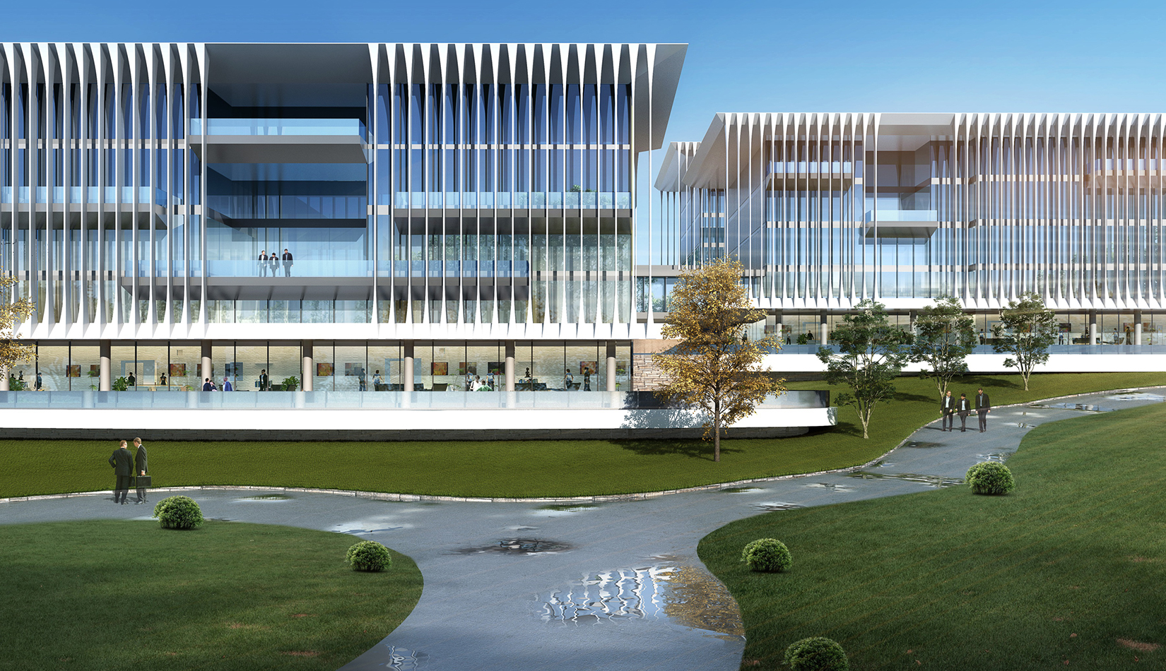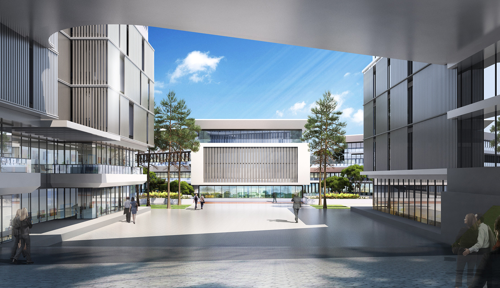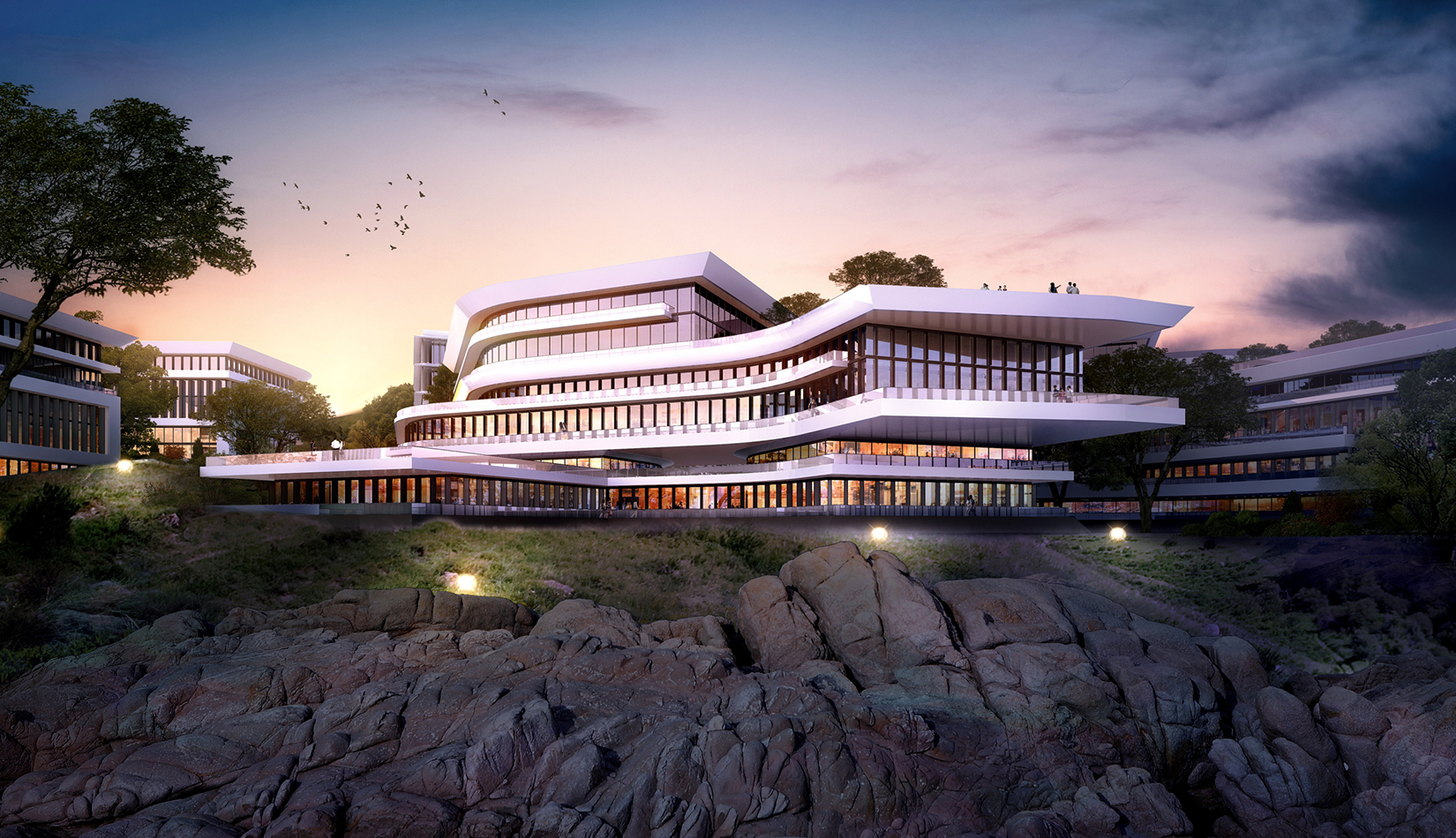 簡潔大氣的豎向橫向劃分,使MECS主樓充滿海洋氣息;白色流線型屋頂順應(yīng)地勢,自由舒展。流線型的體塊靠近海岸線,表達科研人員的探索精神,并且與地勢相結(jié)合。