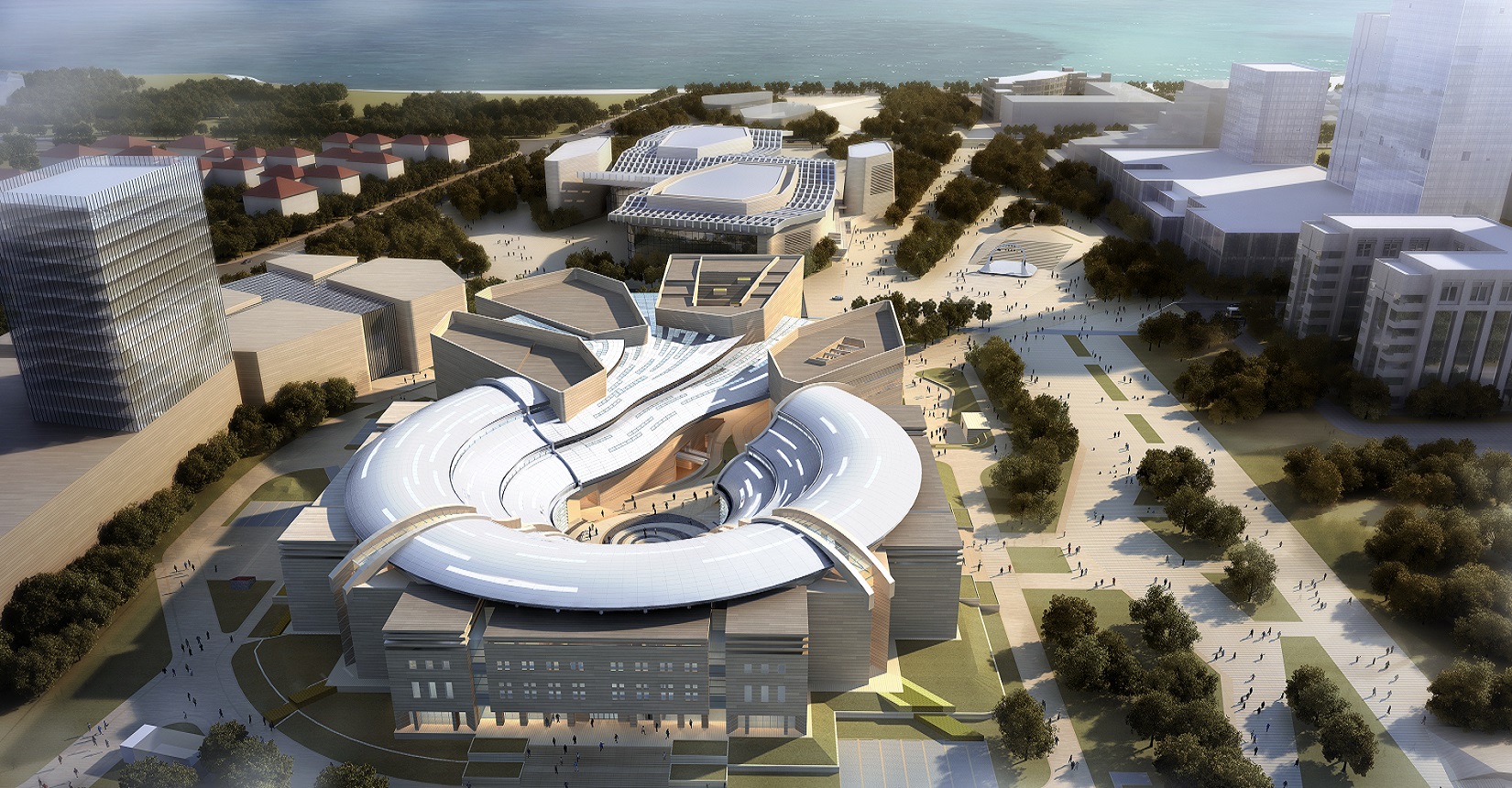 該項目由我院聯(lián)合中國建筑設計研究院崔愷院士團隊共同打造。設計方案以“嶗山石花、海涌浪激”的意向為基調(diào),形成“浪涌石開、時空留痕”的文化景象。